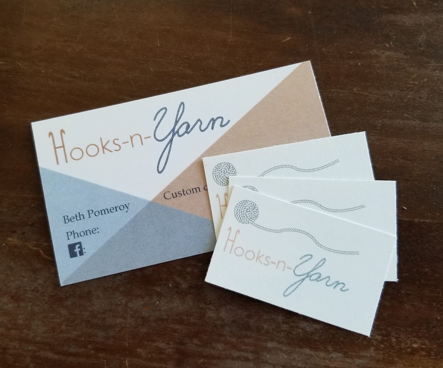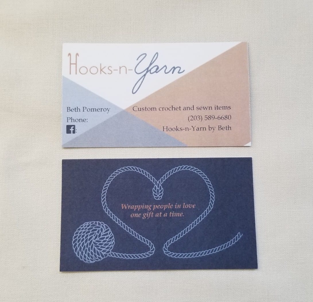 Business cards and tags designed for a woman who does crocheted and sewn goods.
